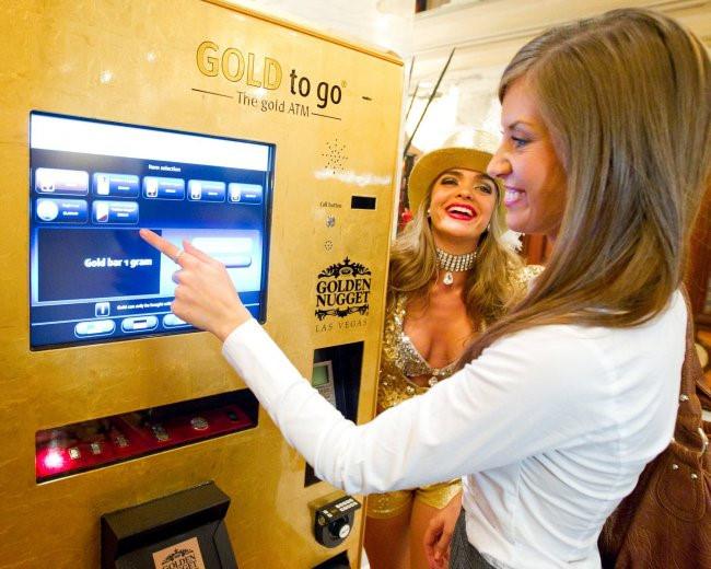 Bạn có thể mua nhiều thứ từ máy bán hàng tự động: Máy ATM vàng ở siêu thị Dubai Mall cho du khách mua từ tiền xu tới miếng vàng 24k. Máy có màn hình hiển thị giá thay đổi 10 phút một lần để theo kịp biến động của thị trường. Tới cửa hàng Sharaf DG ở siêu thị Times Square Centre, bạn có thể mua laptop, máy tính bảng, máy ảnh và điện thoại từ máy bán hàng tự động. Ảnh: Gold Price.