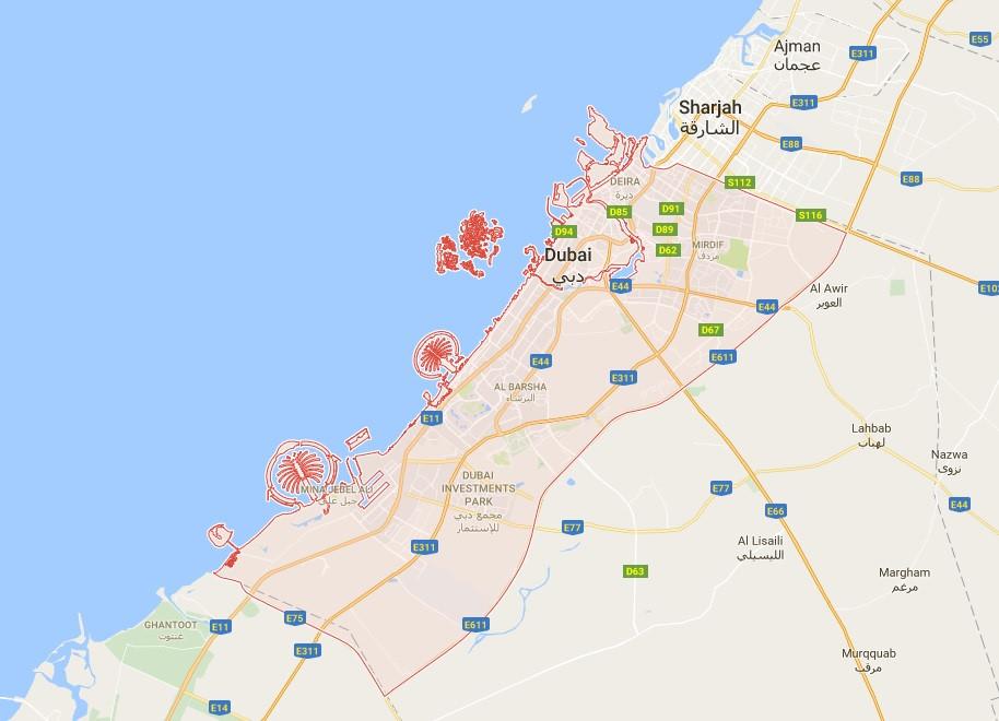 Thành phố Dubai (khu vực khoanh đỏ trên bản đồ) là một trong 7 tiểu vương quốc của Các Tiểu Vương quốc Ả rập Thống nhất, nằm ở phía nam vịnh Ba Tư. Ảnh chụp màn hình.