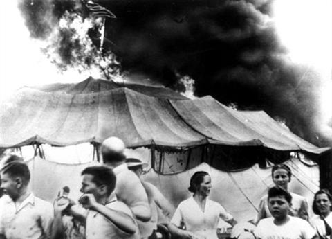 Vào ngày 6/7/1944, một đám cháy nhỏ bắt đầu lan ra từ thành lều chính của nhà Anh em Ringling và Barnum & Bailey. Bởi vì lều này có khả năng chống nước nên nỗ lực dập lửa gặp nhiều trở ngại. Đám đông bảy ngàn khán giả đã vô cùng hoảng loạn lao về phía cửa ra. Tuy nhiên, hai trong số các lối này đã bị chặn bởi máng xối dùng để đưa các con thú vào rạp, khiến cảnh thoát chạy càng hỗn loạn, gây ra thảm kịch giẫm đạp, nghiền nát nhau.