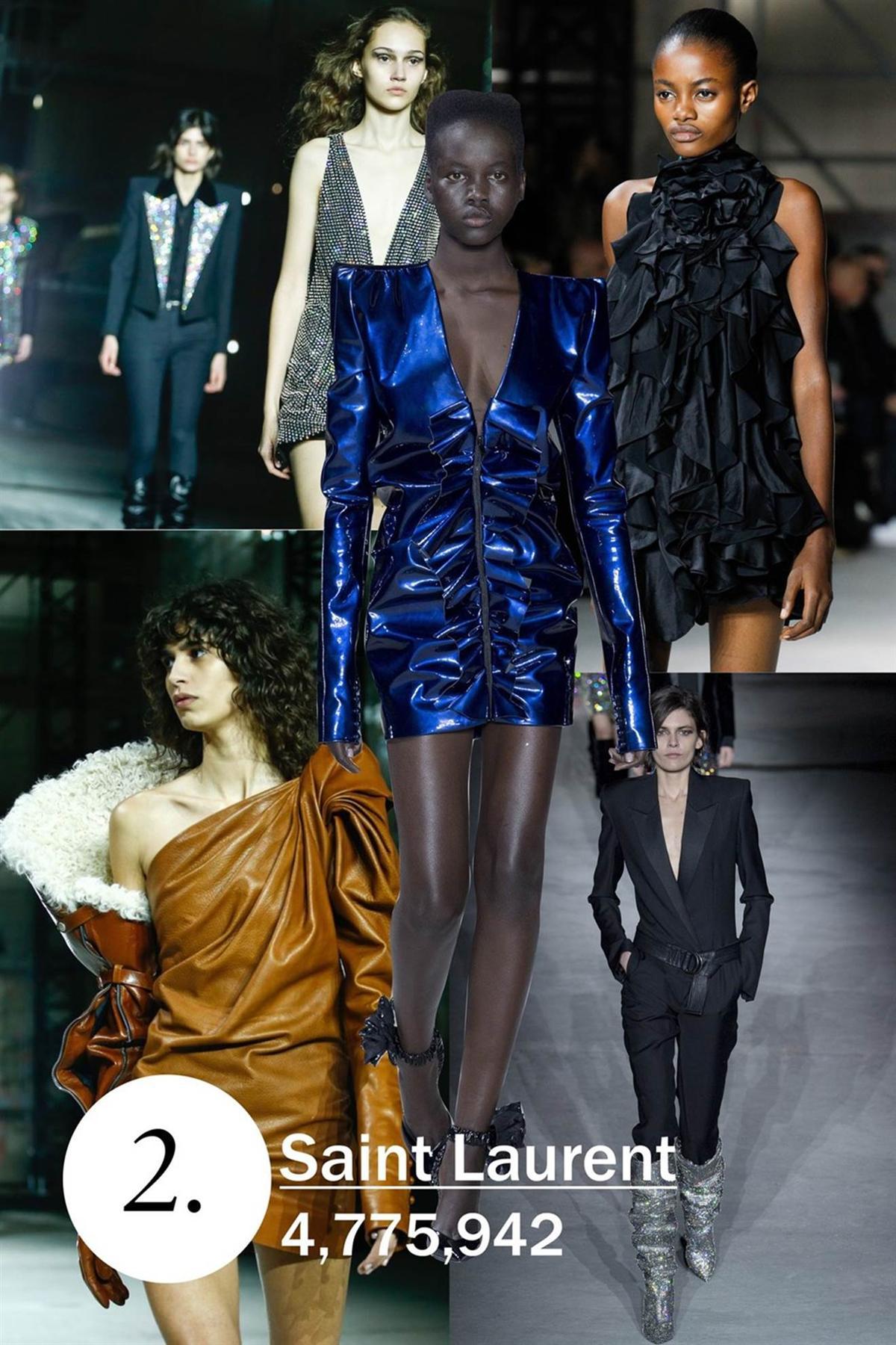 Vị trí thứ 2 thuộc về bộ sưu tập của Saint Laurent. Đó là những mẫu thiết kế mang cảm hứng sexy của thập niên 1980. Giám đốc sáng tạo Anthony Vaccarello lăng xê đầm lệch vai, váy đính sequin, váy áo cầu gai góc cạnh... Đặc biệt, những đôi boots ánh kim là điểm nhấn thú vị ở show này.