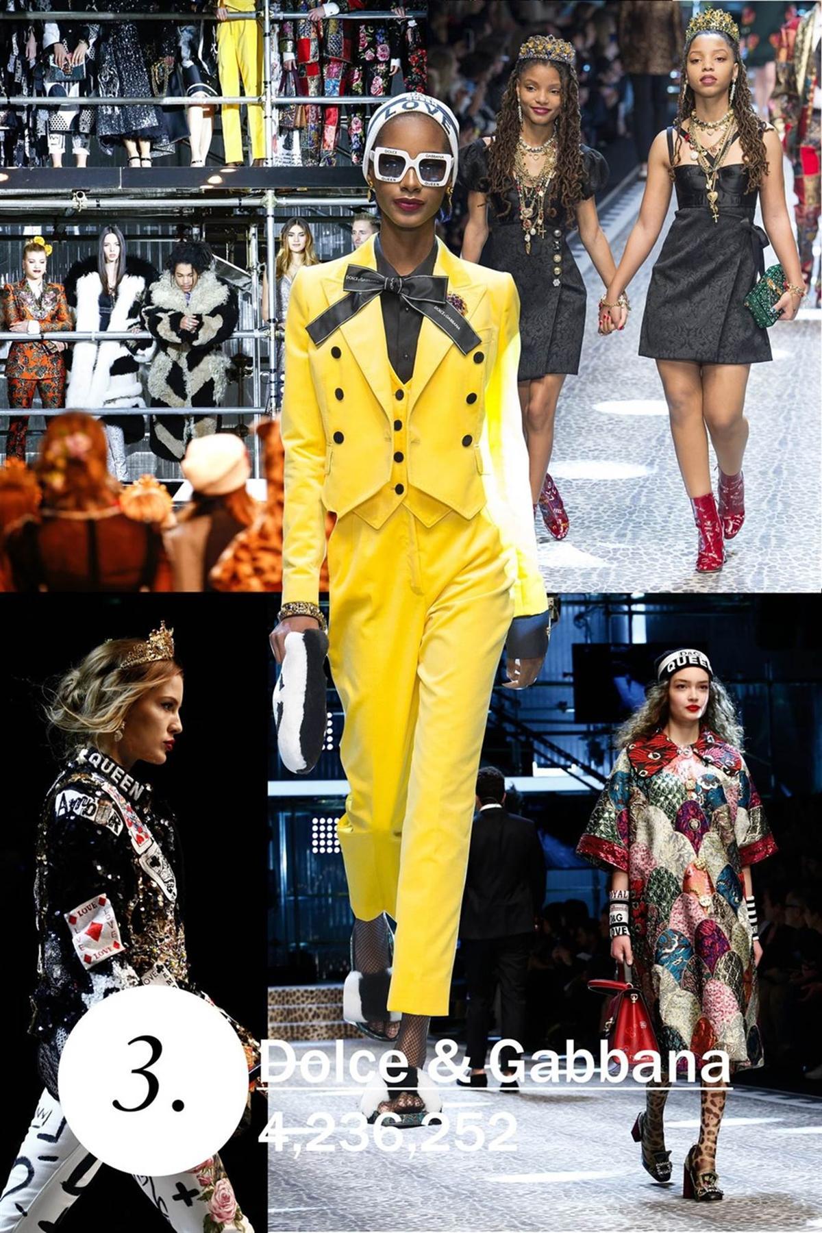 Dolce & Gabbana đứng thứ ba với hơn 4 triệu lượt xem. Độc giả của Vogue nhận xét đây là bộ sưu tập truyền cảm hứng. Nhà mốt Italy còn ghi dấu ấn bằng việc chiêu mộ những gương mặt không phải người mẫu chuyên nghiệp, gồm ca sĩ, blogger, ngôi sao mạng xã hội...