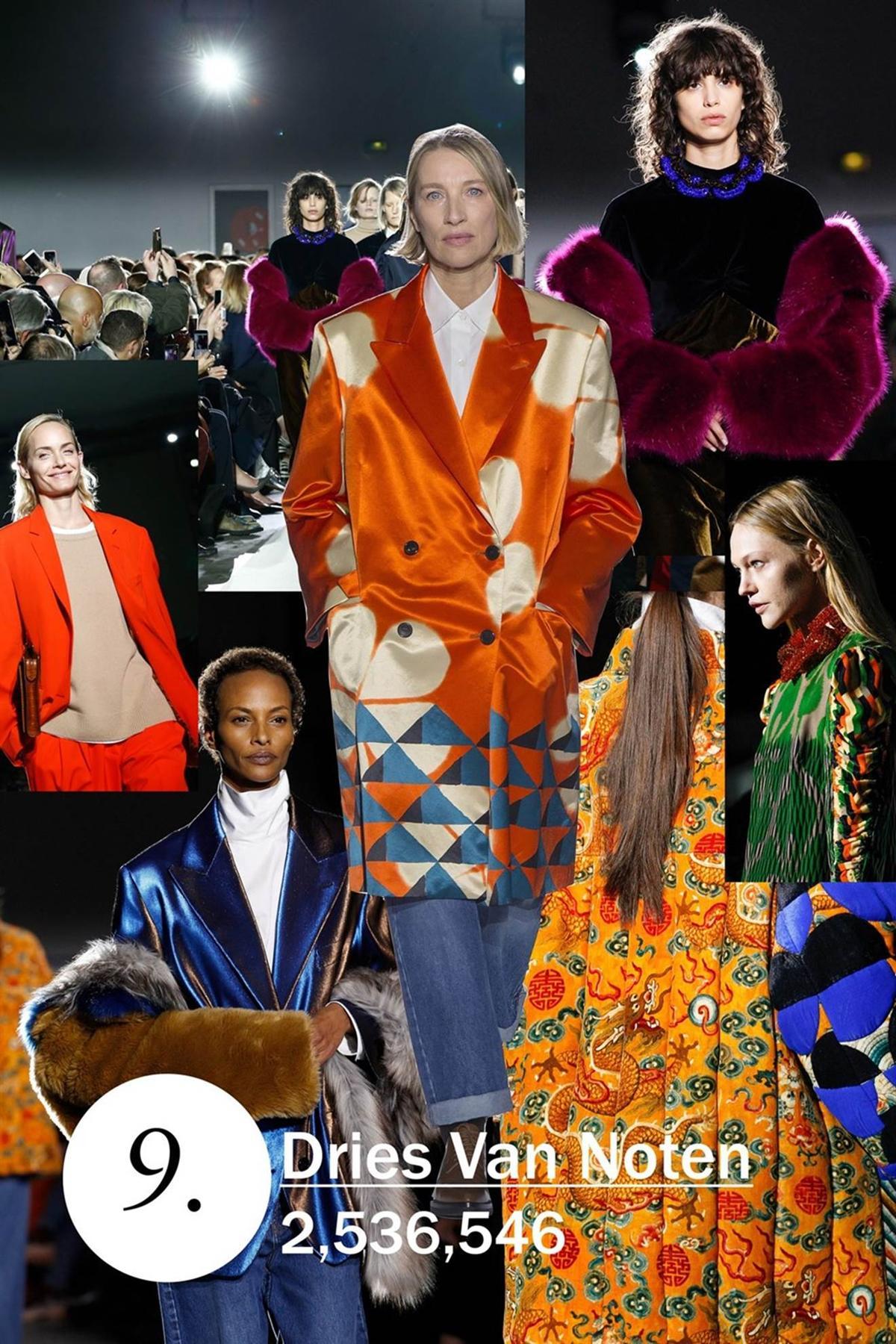 Vị trí thứ 9 dành cho nhà mốt Dries Van Noten với bộ sưu tập họa tiết rực rỡ. Để kỷ niệm show thời trang thứ 100, nhà thiết kế 58 tuổi mang dàn mẫu lừng lẫy một thời quay trở lại sàn catwalk như Nadja Auermann, Cecilia Chancellor, Kirsten Owen, Emma Balfour...