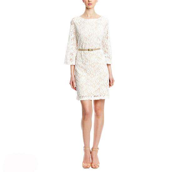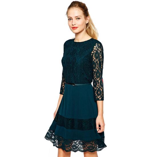 Ren là chất liệu được ưa thích trong các thiết kế váy đầm đẹp mùa thu năm nay. Trên nền hoa văn trắng, kiểu váy tay lửng được cắt may tinh tế. Chiếc thắt lưng màu be tạo điểm nhấn tại vòng 2 cho chị em vóc dáng mảnh mai, duyên dáng.