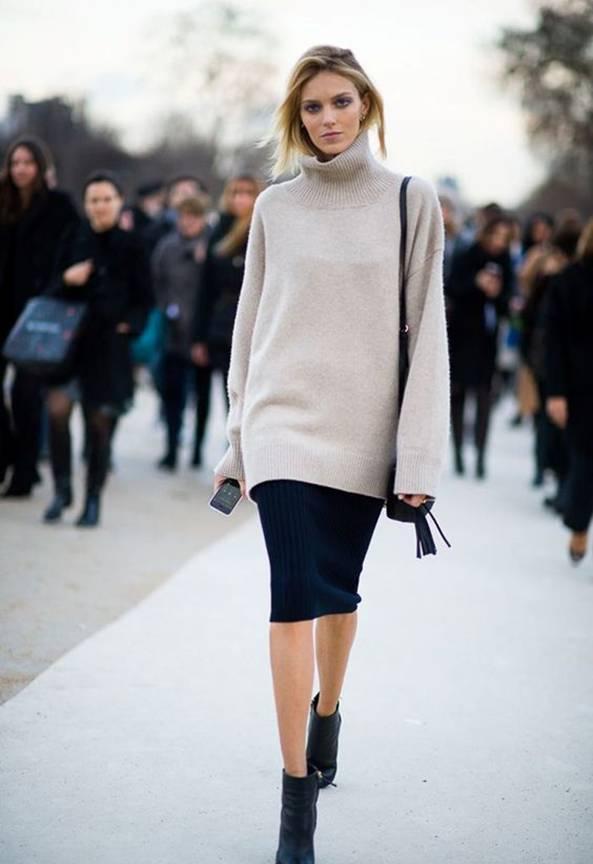 Sự kết hợp thú vị giữa áo len oversized và chân váy bút chì chẳng những giúp bạn ăn gian cân nặng, mà còn khiến người mặc trẻ ra nhiều tuổi. Sự năng động và sành điệu của phong cách này xứng đáng được mọi quý cô ứng dụng cho sự trở lại đầu năm. Đừng quên chú ý tới màu sắc khi lựa chọn áo len và chân váy để mix - match. Một đôi boots cổ ngắn cùng túi xách là cần có để hoàn thiện cây đồ ấn tượng này.