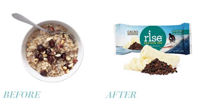 Hoặc tôi sẽ phết bơ hạnh nhân lên 2 miếng bánh mì ngũ cốc nướng, thêm mấy lát chuối bên trên và một chút xíu mật ong. Sau đó, tôi chọn loại bột protein hoàn toàn tự nhiên, không gia vị như Vega hay Garden of Life và hòa chúng với nước. Hoặc một thanh protein – tôi tìm kiếm loại có chứa 15-20g protein và có rất ít hoặc không chứa chất bảo quản.