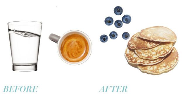 Karena: Việc đầu tiên tôi làm vào buổi sáng là tập luyện. Do đó, tôi uống một ly nước lớn để bổ sung nước cho cơ thể và hay chọn tăng cường năng lượng bằng một ly cà phê gấp 3 lần espresso và một chút sữa hạnh nhân trước tập.