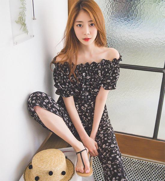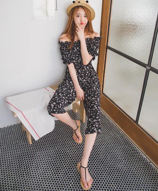 Ngoài những trang phục gam màu đen một màu, bạn có thể làm đẹp cho mình bằng những mẫu họa tiết hoa văn màu đen thú vị. Một bộ jumpsuit đen, chấm phá họa tiết trắng nhỏ, thiết kế trễ vai luôn phù hợp với mọi cô nàng. Bạn nên mix thêm cho mình một đôi xăng đan mảnh dẻ, mũ cói vành nhỏ sẽ vô cùng hoàn hảo rồi đấy.