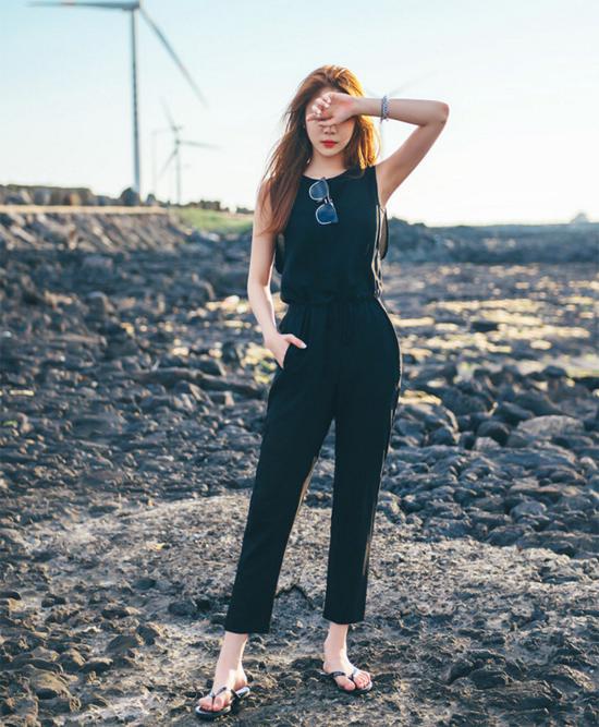 Mát mẻ, lôi cuốn là khi bạn khoác lên mình bộ jumpsuit màu đen khoét vai. Bạn có thể sử dụng item này cho những ngày đi picnic, dạo phố, đi biển...