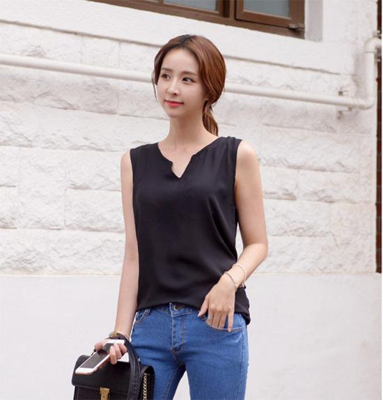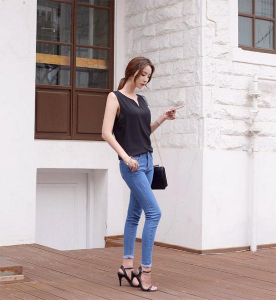 Việc lựa chọn chất liệu cũng rất quan trọng. Do đó, bạn nên thiên về chọn cho mình một chiếc áo đen chất liệu lụa mềm mại. Quần jeans xanh kết hợp áo khoét nách màu đen tuy đơn giản nhưng lại giúp bạn thể hiện sự hiện đại, năng động.