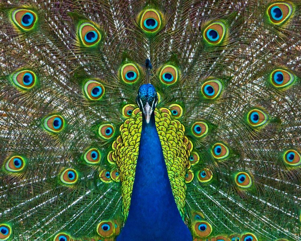 Chim công: Bộ lông của những con công đực thực sự là một tác phẩm nghệ thuật. Những sợi lông đuôi sắc sặc sỡ được con đực sử dụng khi “tán tỉnh” con cái. Màn múa xòe đuôi cuả chim công đực có lẽ là màn trình diễn tình yêu đẹp nhất trong họ nhà chim. Ảnh: Cincinnatizoo.org.