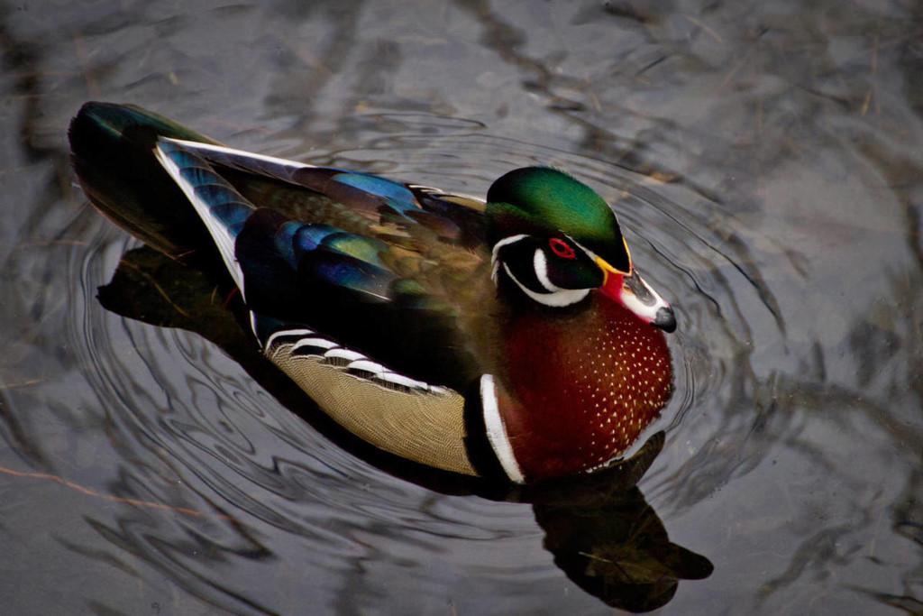 Vịt gỗ (vịt Carolina): Gọi là vịt, nhưng đây là một loài chim thuộc họ vịt, sống chủ yếu ở vùng đầm lầy Bắc Mỹ, là loài chim nước có màu sắc nổi bật nhất trên thế giới. Con đực có đầu màu xanh lá cây và màu tím, bụng màu trắng, ngực màu đỏ sẫm chấm trắng. Dọc theo cổ, là những sọc trắng nhỏ hấp dẫn. Đôi cánh màu xanh và đen. Vịt gỗ cái nhiều màu và đẹp như con đực. Chúng có đầu màu nâu xám, bụng màu trắng. Ảnh: Deseretnews.com.