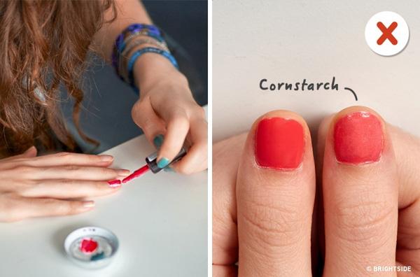 Với mẹo làm đẹp này, Diana cùng thêm ít bột bắp vào lọ sơn móng tay, sau đó vẽ lên móng của mình. Bề mặt sơn sau khi khô trở nên gồ ghề, thiếu mịn màng và bóng sáng, khiến màu móng không hoàn hảo như bình thường.