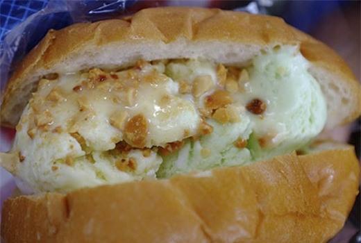 Bánh mì kem đơn giản chỉ là bánh mì mềm, kẹp thêm hai đến ba muỗng kem tròn, rắc đậu phộng rang và sữa đặc. Nhưng nó đặc biệt ở chỗ bánh mì khi gặp kem lạnh mà không hề bị khô cứng, vẫn giữa được độ mềm dai cần thiết. Bánh mì, kết hợp với kem tạo ra một hương vị độc đáo, vừa ngọt vừa mát mang đến cảm giác mới lạ không ngờ.