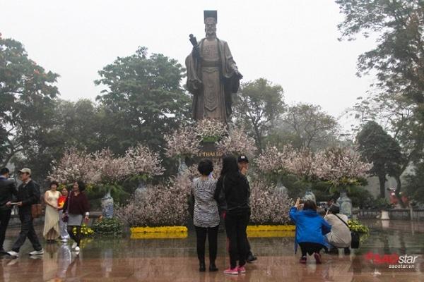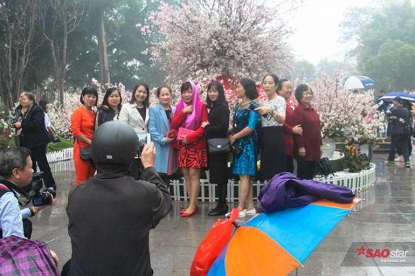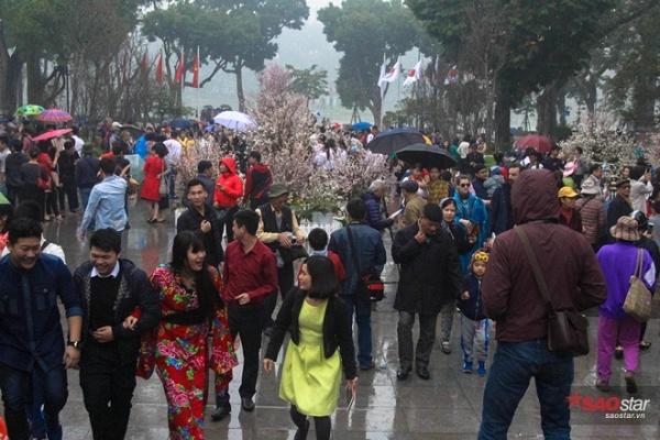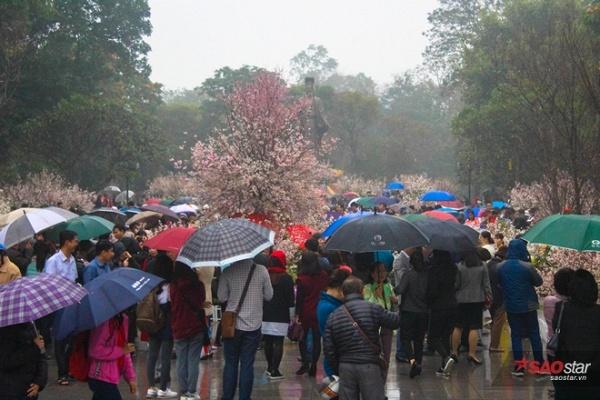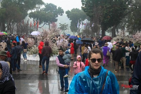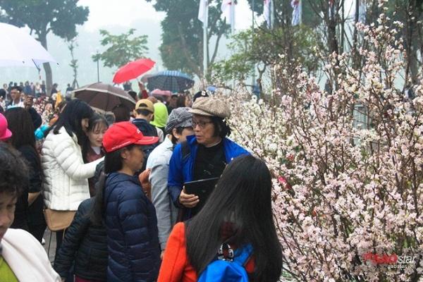 Mặc trời mưa gió, hàng ngàn lượt khách đã đổ về khu vực tượng đài Lý Thái Tổ, Hoàn Kiếm, Hà Nội để tham dự Lễ hội hoa anh đào 2017.