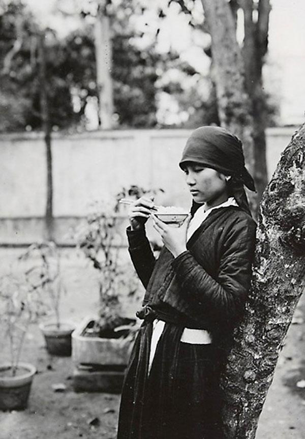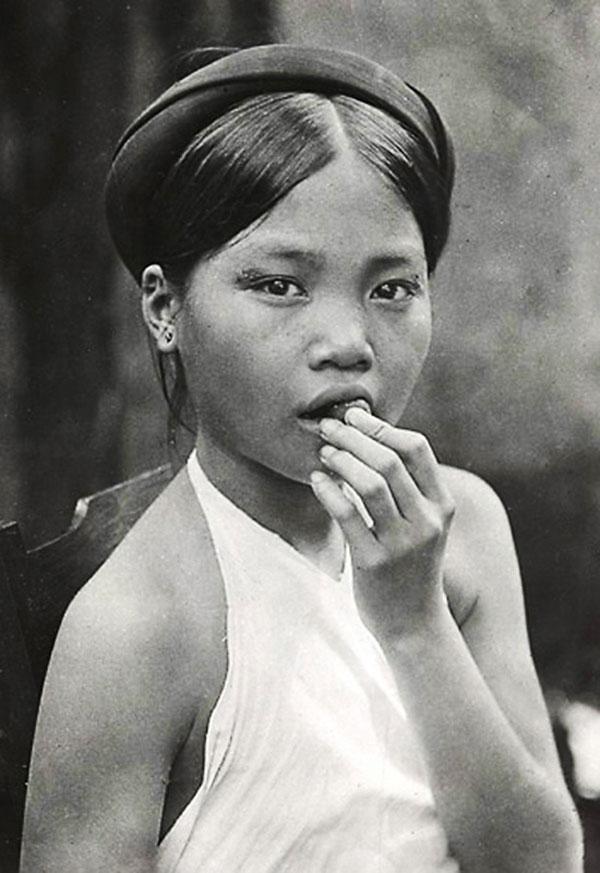 Nét dịu dàng e ấp của một thiếu nữ nông thôn Việt Nam xưa bên gốc cây.Ánh mắt ngây thơ của một cô gái Việt đang nhai miếng trầu.