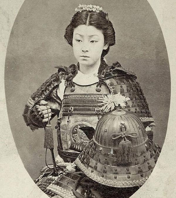 Nữ chiến binh Nhật Bản trong trang phục chiến đấu với đôi mắc sắc lạnh và nghiêm nghị.