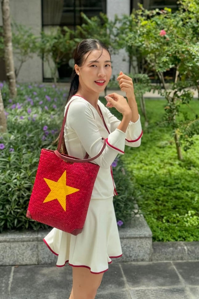 Á hậu Hoàng Oanh xuống phố trong set váy áo nữ tính và đeo túi cói mô phỏng quốc kỳ.