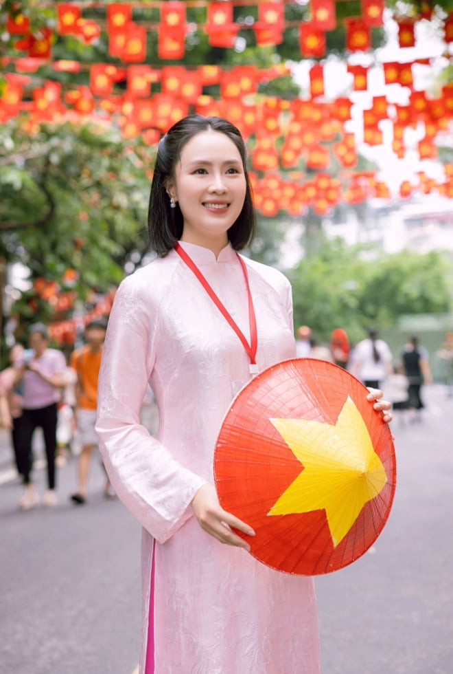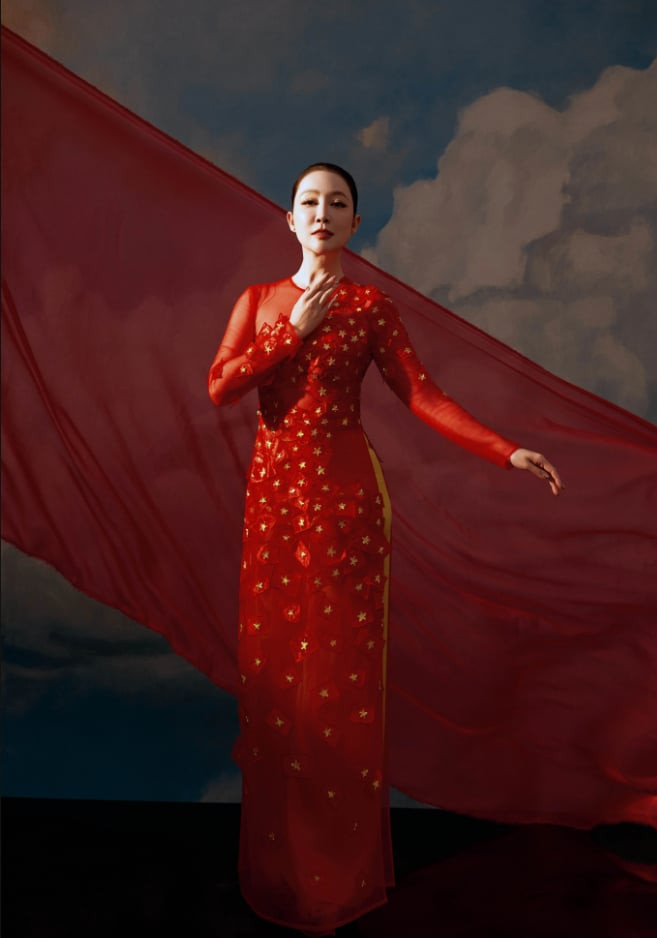 Hòa chung không khí kỷ niệm ngày Quốc khánh, NSƯT Linh Nga diện chiếc áo dài đính 290 lá cờ cách điệu làm thủ công từ chất liệu organza. Những ngôi sao được thêu chỉ vàng, đính đá và cườm gold bắt sáng, tạo hiệu ứng nổi bật. Lấy sắc đỏ nồng nàn làm chủ đạo thể hiện tinh thần hân hoan của ngày lễ trọng đại, các họa tiết biểu tượng như lá cờ tung bay, đóa sen, cánh chim tự do... được khắc họa, gửi gắm thông điệp về hành trình hướng tới hòa bình và khát vọng tương lai.