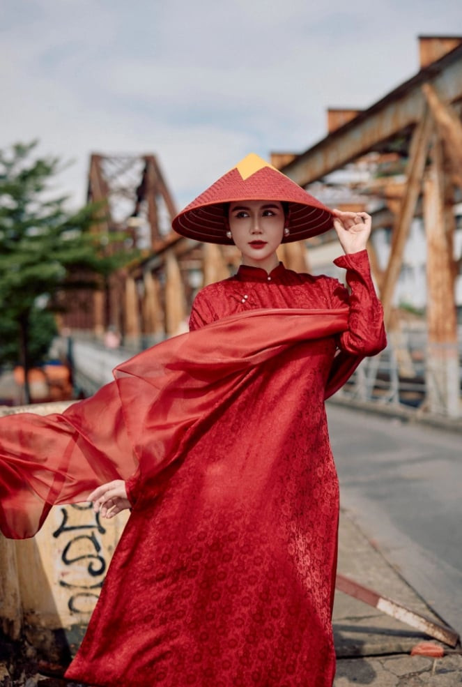 Á hậu Thúy Vân khẳng định lòng tự hào dân tộc qua cách kết hợp màu đỏ - vàng nổi bật mà hài hòa.