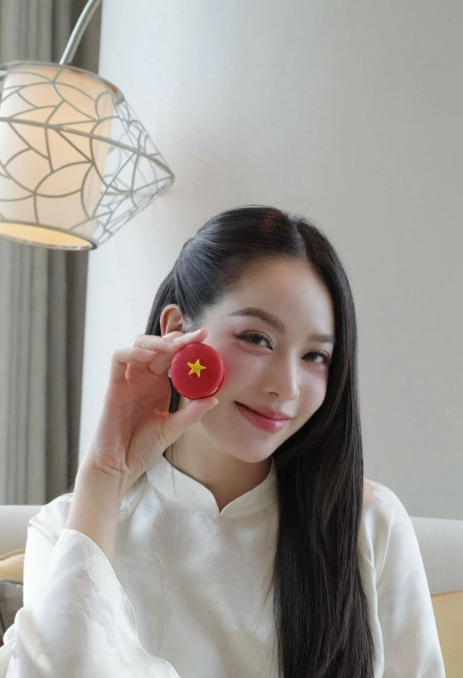 Hoa hậu Thanh Thủy có phụ kiện độc đáo là chiếc bánh "macaron lá cờ" nhỏ xinh.