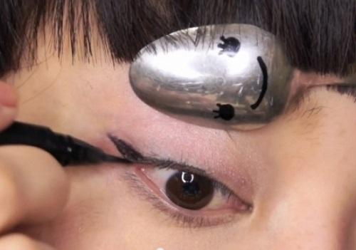 Đối với cô nàng muốn sở hữu đôi mắt mềm mại, quyến rũ. Bạn có thể dùng chiếc muỗng kẻ một đường thẳng xéo để cố định đuôi mắt nước sẽ vẽ. Sau đó, lợi dụng độ cong của chiếc muỗng để tạo ra đuôi mắt mèo ưng ý mà không sợ bị lem.