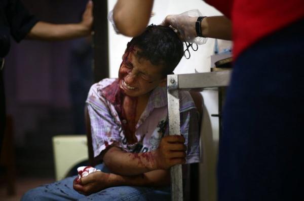 Một cậu bé đang được băng bó vết thương sau cuộc tấn công ở Duma ngày 12/8/2015