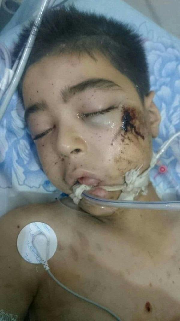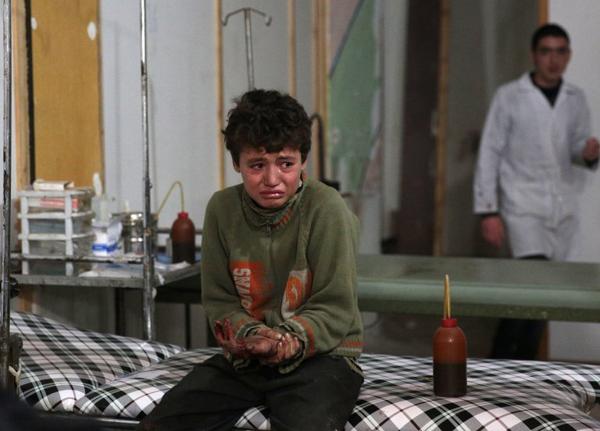 Salam, bé trai 8 tuổi gào khóc tại bệnh viên sau vụ không kích của phiến quân nổi loạn ở gần Douma, phía đông thủ đô Damascus.