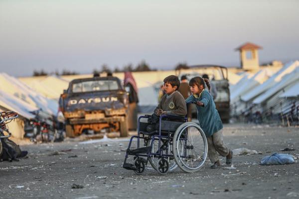 Một em bé di cư khác đang đẩy chiếc xe chở cậu bé bị cụt chân. Hai đứa trẻ đều sống tại lều tạm của người di cư ở biên giới Syria, gần thị trấn Aleppo
