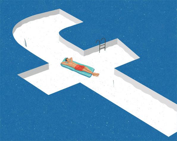 Trong mắt của họa sĩ John Holcroft, mạng xã hội Facebook không khác gì bể bơi đầy cá mập. Nếu quá đắm chìm vào đó, con người sẽ không nhận thấy các mối nguy hiểm rình rập.