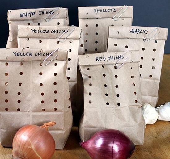 Người bạn tốt nhất của tỏi và hành tây là bóng tối. Bạn có thể đặt chúng trong túi giấy với nhiều lỗ nhỏ đục lỗ để thoáng khí. Bằng cách đó bạn có thể lưu trữ chúng khá lâu, tiện mang đi mang lại mà vẫn đảm bảo đặc tính không ưa ánh sáng của chúng.