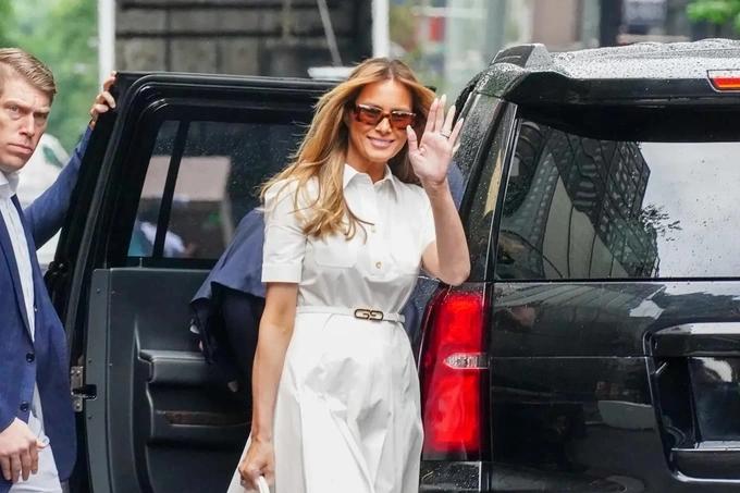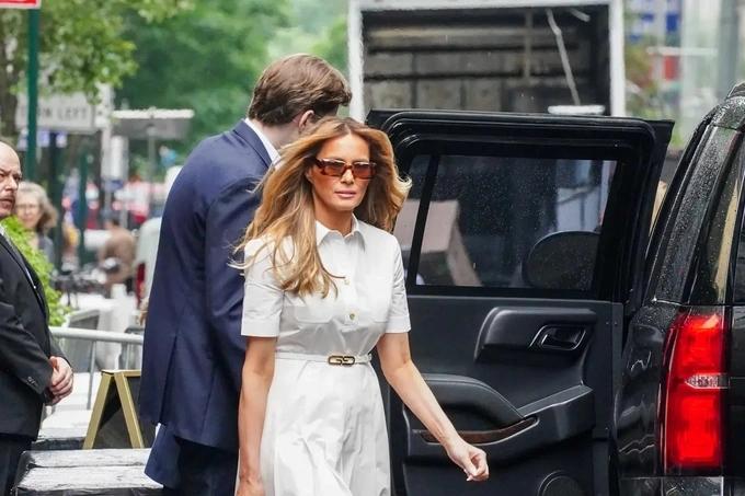 Cùng đồng hành với bà Melania và Barron còn có những vệ sĩ. Trong khi bà Melania vui vẻ vẫy tay chào khi xuất hiện trước ống kính thợ săn ảnh, Barron nhanh chóng di chuyển vào trong xe và không có bất cứ tương tác nào.