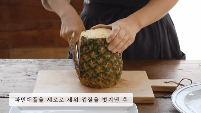 - Cắt bỏ đầu và đuôi quả dứa. Sau đó, dùng dao gọt sâu vào vỏ dứa theo chiều dọc từ trên xuống của quả. Vết cắt sâu để mất luôn mắt dứa. Cách này giúp bạn không mất nhiều thời gian khi tỉa mắt dứa.