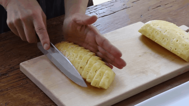 - Úp miếng dứa xuống rồi dùng dao cắt ngang các miếng dứa thành các miếng nhỏ vừa ăn.