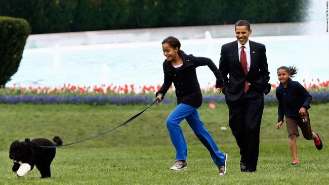 4. Hau cô con gái đi dạo cùng cha và chú chó cưng trong khu vườn của Nhà Trắng tháng 4/2009.