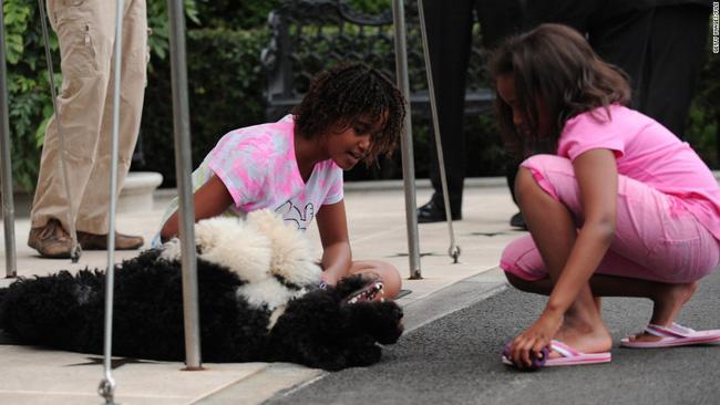 6. Sasha và Malia chơi cùng chú chó Bo khi 2 chị em đang chờ phi cơ của cha hạ cánh tại Nhà Trắng tháng 9/2009.