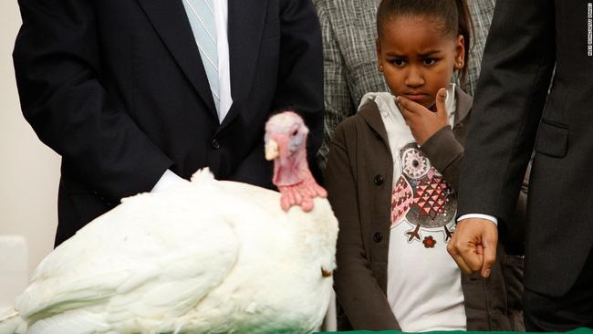 7. Sasha nhìn chú gà tây có tên Courage trong lễ xá tội truyền thống nhân ngày Tạ ơn, tháng 11/2009.