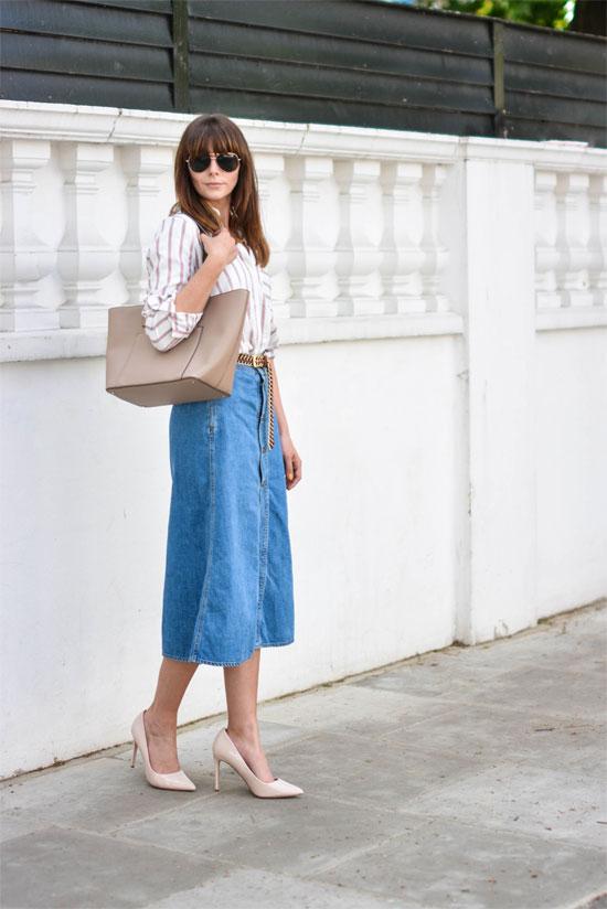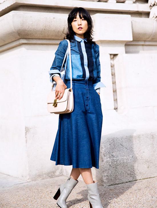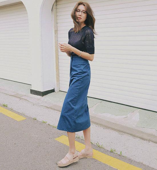 Mang hơi hướng cổ điển nhưng chân váy midi denim chưa bao giờ bị lỗi mốt. Khác với chân váy mini, chân váy midi thường dài chấm bắp chân hoặc có thể gần chấm mắt cá chân. Váy midi có nhiều kiểu dáng như bút chì, chữ A, dáng xòe... Tuy nhiên, tất cả đều có "phẩm chất" là giúp người mặc thêm duyên dáng, dịu dàng và yêu kiều.