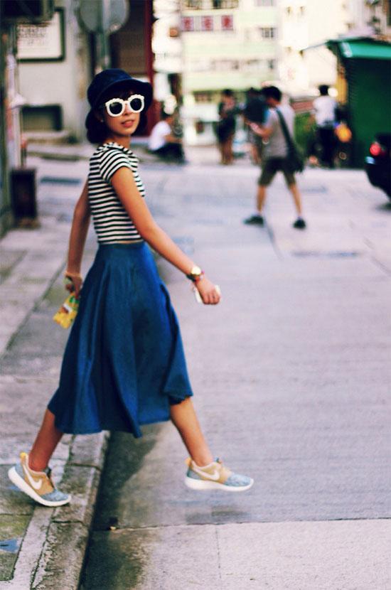 Cũng như chân váy mini, chân váy midi là món đồ "dễ tính" khi bạn có thể thoải mái kết hợp với item mình yêu thích. Tuy nhiên, nếu cô nàng dáng người thấp bé, thì nên cẩn thận khi mặc chân váy midi vì nó dễ làm bạn lộ khuyết điểm. Chân váy midi rất lý tưởng cho người cao hay những cô gái cao nhưng đôi chân to, thô, cong, sẹo. Chiều dài của váy sẽ là "vũ khí" giúp bạn "đá bay" điểm yếu để trở thành quý cô hoàn hảo chốn đông người.
