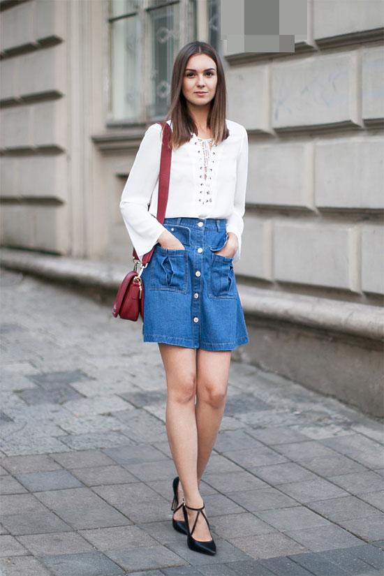 Những bạn gái dáng người thấp bé khi diện chân váy mini denim sẽ rất hữu ích để bạn tạo "chiều cao ảo" đánh lừa con mắt người đối diện.