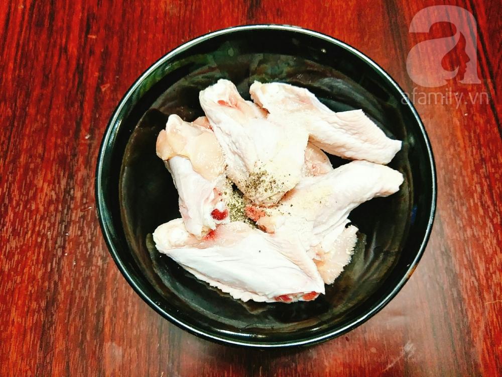 Cánh gà rửa sạch với chút giấm và muối, thấm cho khô sau đó chặt cánh gà làm 2 khúc cho vào bát, ướp cánh gà với 1 chút muối, tiêu, bột nêm và trộn đều ướp cánh gà 20 phút cho ngấm gia vị.