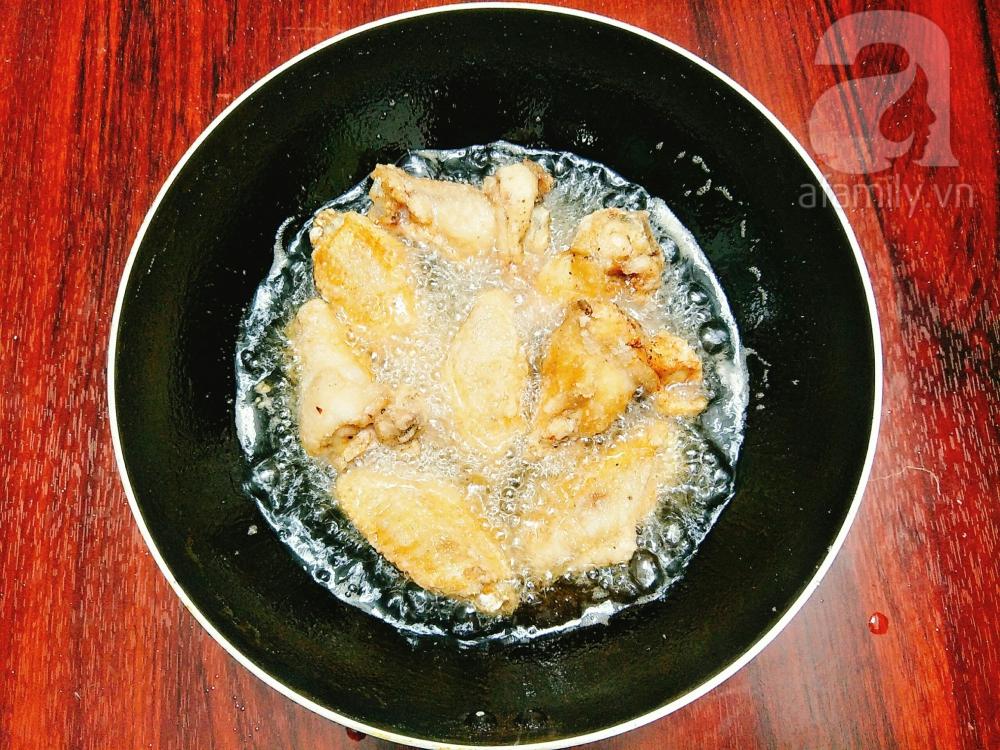 Cho nhiều dầu vào chảo đun cho nóng dầu thì gắp cánh gà vào chiên tới khi cánh gà chín vàng giòn thì vớt ra đĩa.
