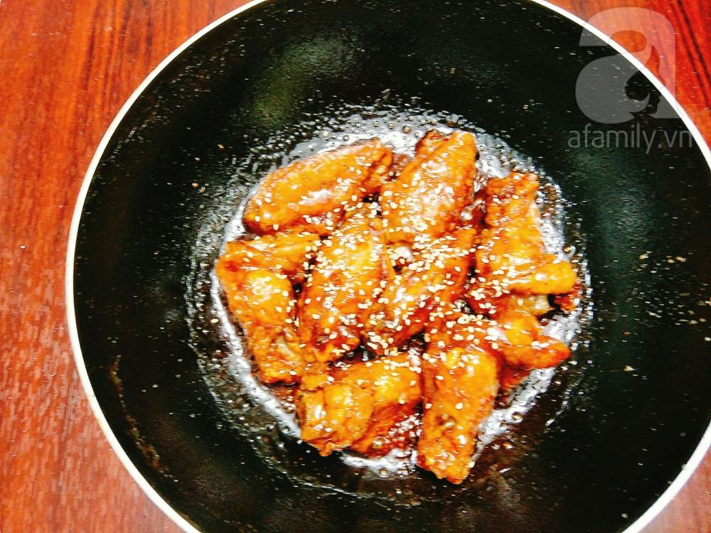 Cho chảo sạch lên bếp với 1 thìa dầu đun cho nóng dầu, sau đó bạn cho hỗn hợp nước sốt vào đun sôi, trút toàn bộ cánh gà chiên giòn vào đảo đều cho cánh gà bám 1 lớp nước sốt bên ngoài là tắt bếp, rắc vừng trắng lên trên và gắp cánh gà ra đĩa để thưởng thức.