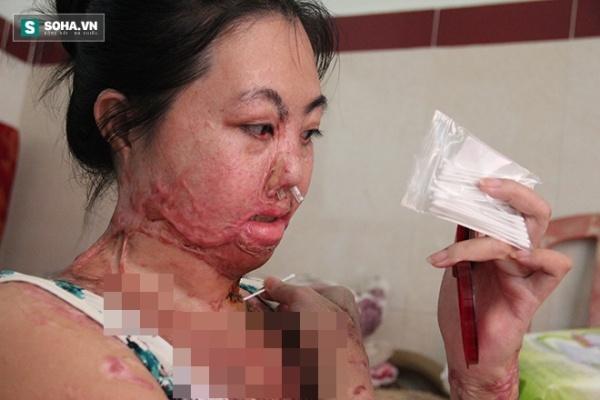 Nhìn người phụ nữ này, ai cũng không khỏi rùng mình thoáng chút sợ hãi. Gương mặt tròn vành vạnh của chị bị biến chứng, những vết sẹo lồi lõm kéo hai má chảy xệ xuống, mí dưới căng ra khiến đôi mắt khô khốc đỏ ngầu, mũi bị sụp xuống, chị phải đưa ống cao su vào mũi mới thở được.