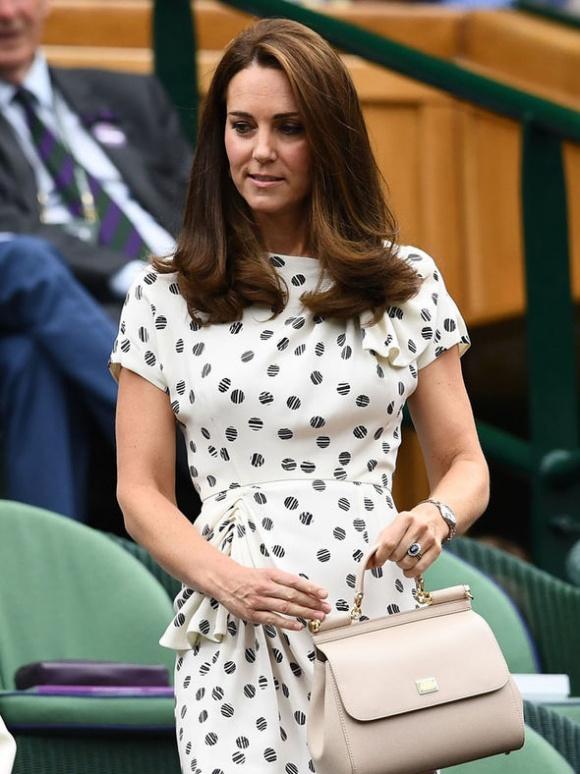 Vốn yêu thích phong cách thời trang duyên dáng, nữ Công tước xứ Cambridge diện đầm trắng họa tiết đen đến từ thương hiệu Jenny Packham. Cô mang theo túi xách Dolce & Gabbana trị giá 1.050 bảng Anh.