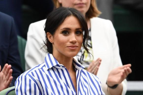 Công nương Meghan Markle lại sành điệu khi diện áo kẻ sọc kết hợp quần ống rộng.