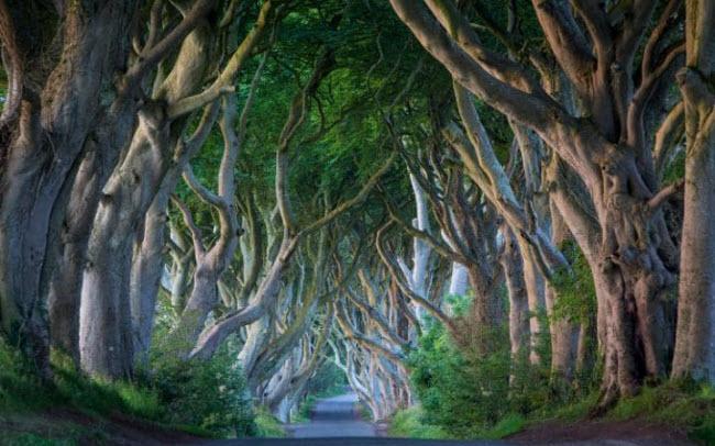 Dark Hedges: Con đường này nằm gần ngôi làng Armoy ở Bắc Ireland. Hàng cây sồi hai bên đường được trồng trong những năm 1750 bởi gia đình Stuart, vì họ muốn tạo ra một cảnh quan hấp dẫn để gây ấn tượng với du khách ở gần lối vào ngôi biệt thự của mình. Hình ảnh hàng cây tuyệt đẹp cũng thường xuyên xuất hiện trong phim "Game of Thrones".