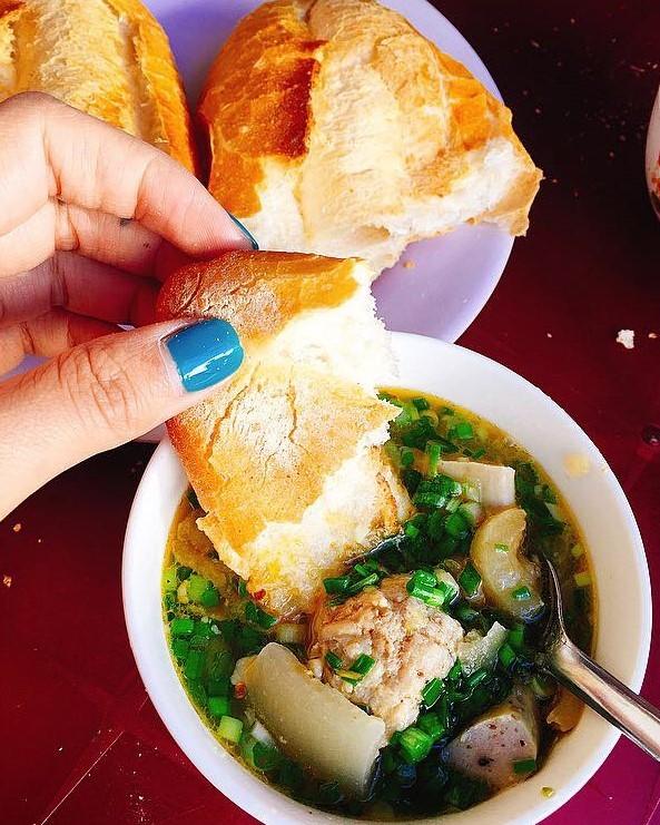 Nước xíu mại ở đây hơi nhiều mỡ hành, nhưng rất ngon. Ngoài bánh căn, bạn có thể ăn cùng với bánh mì.