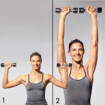 - Thở ra và từ từ đẩy tạ lên cao đến khi tay bạn vuông góc với sàn.