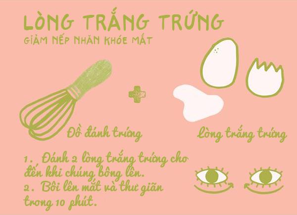 Trứng chứa một lượng lớn protein và vitamin giúp làm mờ vết nhăn hiệu quả. Bên cạnh đó, lòng trắng trứng còn khiến vùng da quanh mắt của bạn thêm mịn màng và tươi sáng.