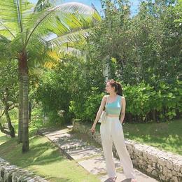 Cô nàng Seohuyn cũng chọn mẫu áo vạt xéo màu xanh mát mắt khi đi du lịch. Chiếc áo với chất liệu thun co giãn mang lại cảm giác vừa thoải mái vừa tiện lợi cho người mặc. Khi diện chiếc áo này, bạn có thể buộc tóc đuôi ngựa để trông tổng thể gọn gàng hơn.